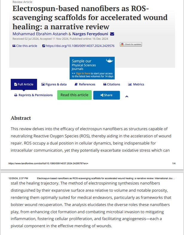 نانوالیاف مبتنی بر الکتروریسی به عنوان داربست‌های مهارکننده ROS برای بهبود سریع زخم: مروری روایی