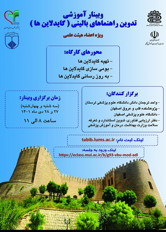 وبینار آموزشی تدوین راهنمای بالینی (گاید لاین ها) ویژه اعضای محترم هیات علمی به صورت مجازی توسط واحد ترجمان دانش دانشگاه علوم پزشکی لرستان با همکاری پژوهشکده قلب اصفهان، دانشگاه علوم پزشکی اصفهان و دفتر تدوین استاندارد و راهنماهای سایت وزارت بهداشت، درمان و آموزش پزشکی با محور های آموزشی (تهیه گاید لاین ها، بومی سازی گاید لاین ها، بروز رسانی گاید لاین ها)  روز سه شنبه و چهار شنبه  مورخ 27 و 28دی ماه 1401 برگزار خواهد شد.